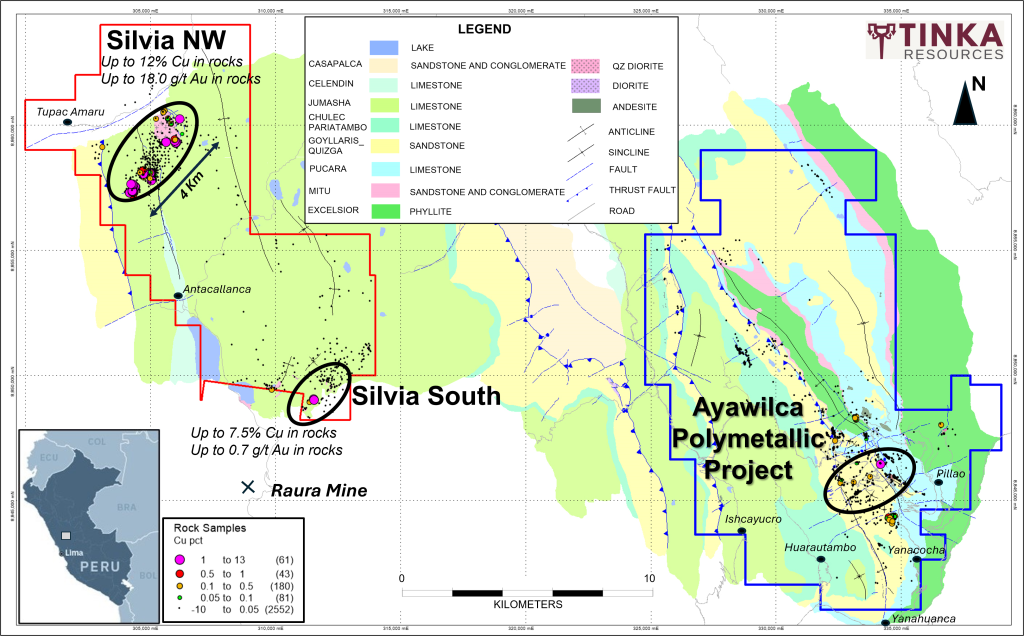 Tinka holds a total of 77 granted mining concessions in central Peru covering 28,915 hectares (289 km2) held by two 100%-owned subsidiary companies: Tinka Resources S.A.C. holds 59 granted mining concessions covering 16,809 hectares of the Ayawilca zinc-silver-tin project in the Department of Pasco (also includes Colquipucro silver project which is 1.5 km north of the Ayawilca Zinc Zone); the other properties include the Silvia copper silver project which is located adjacent the Ayawilca and Tinka’s Pampahuasi gold project, which are held by Tinka’s other subsidiary, Darwin Peru S.A.C.