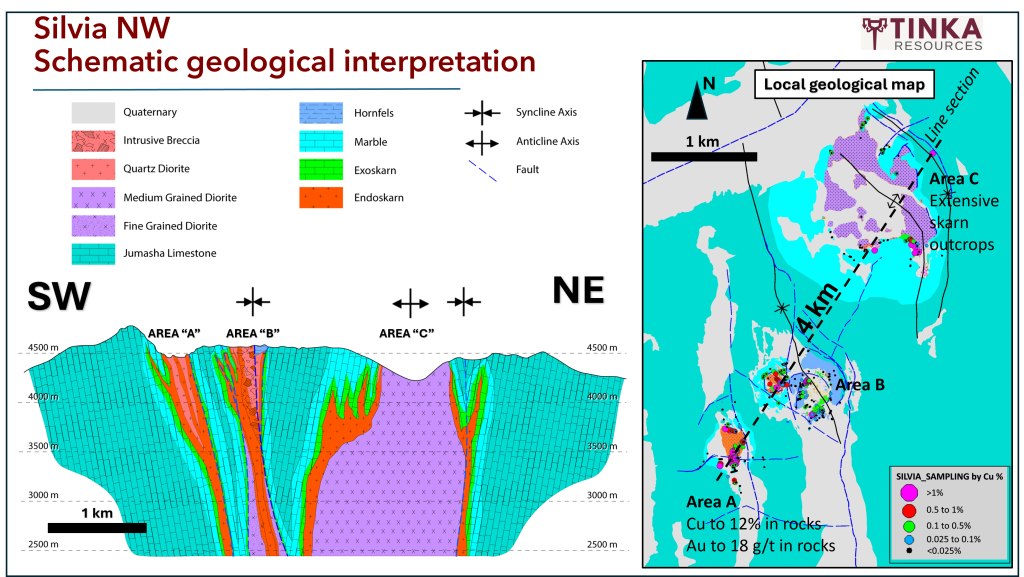 At Silvia NW, copper-gold bearing skarn outcrops over an area covering approximately 4 km2 associated with various diorite and granodiorite intrusions and dikes. A map of Silvia NW with an interpretive geological cross section is included below. The largest of the skarn outcrops, “Area A”, covers an area of around 500 metres by 100 metres, where surface channel samples up to 2.7% copper and 22 g/t gold over 2 metres have been sampled. A single channel sample at Area A returned 46 metres grading 0.8% copper and 1.9 g/t gold - news release Nov 10/21. The Company carried out a drone magnetic survey in 2024, resulting in several magnetic anomalies on the property which are either associated with buried intrusions or potentially copper-gold mineralization, which occurs in association with magnetite. The Silvia NW area is also believed to be prospective for a porphyry copper-gold system at depth.